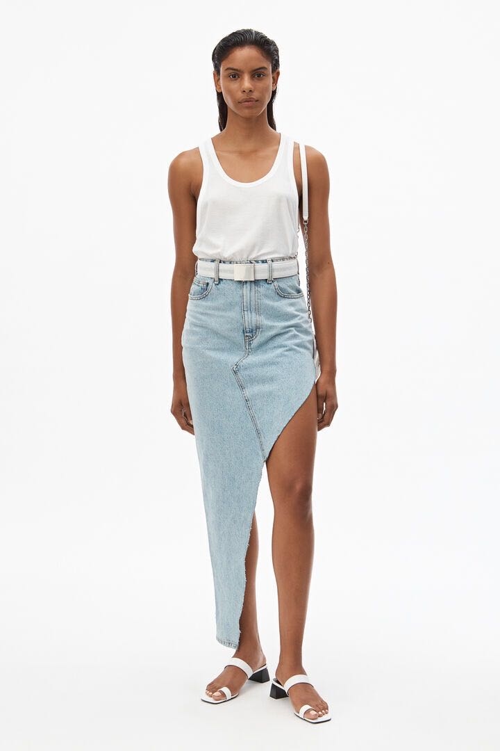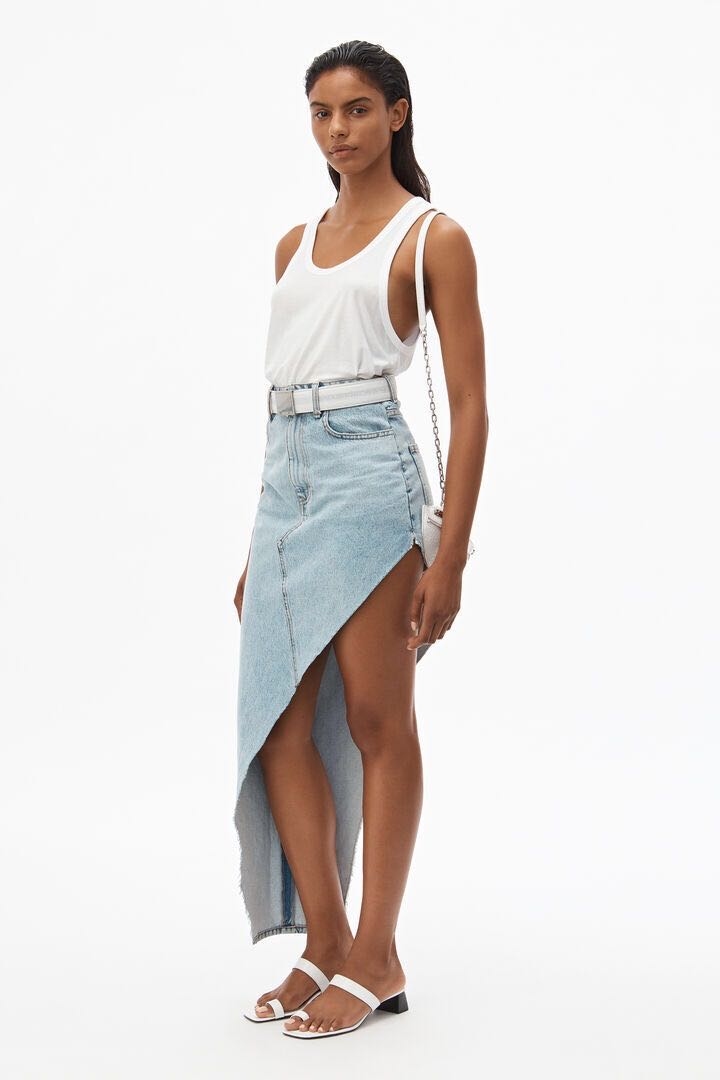 20歐美‎高衩斜邊設計牛仔裙