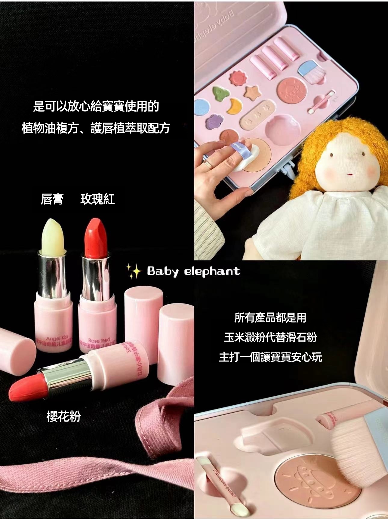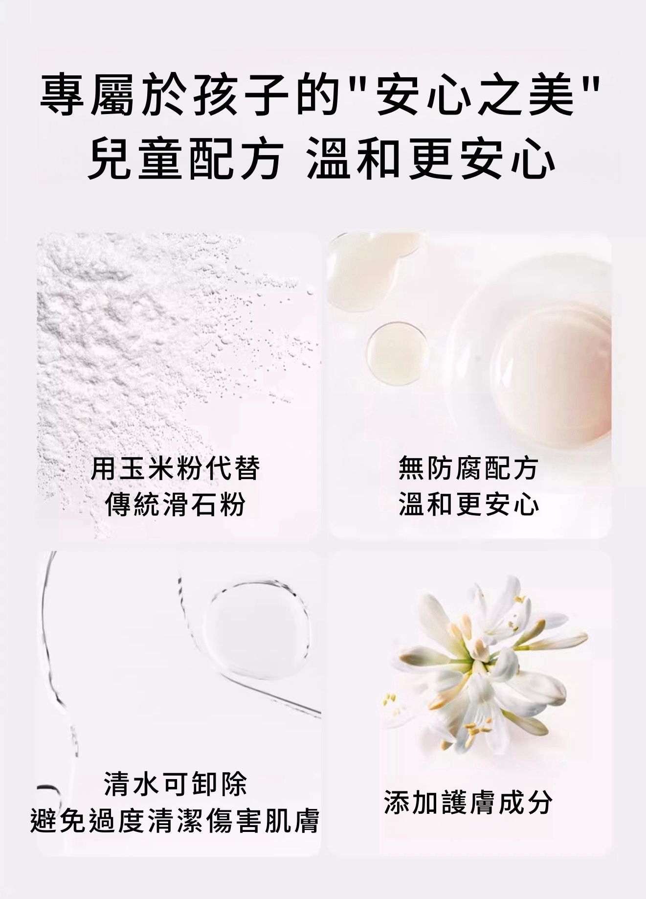 玉米澱粉、角鯊烷、牛油果樹果脂、白池花籽油、荷荷巴籽油、巴巴蘇籽油、澳洲堅果籽油。