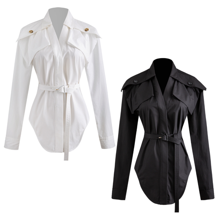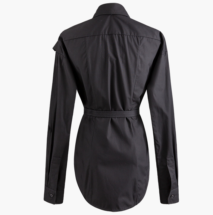 歐美肩裝飾三角腰扣弧形下擺襯衫